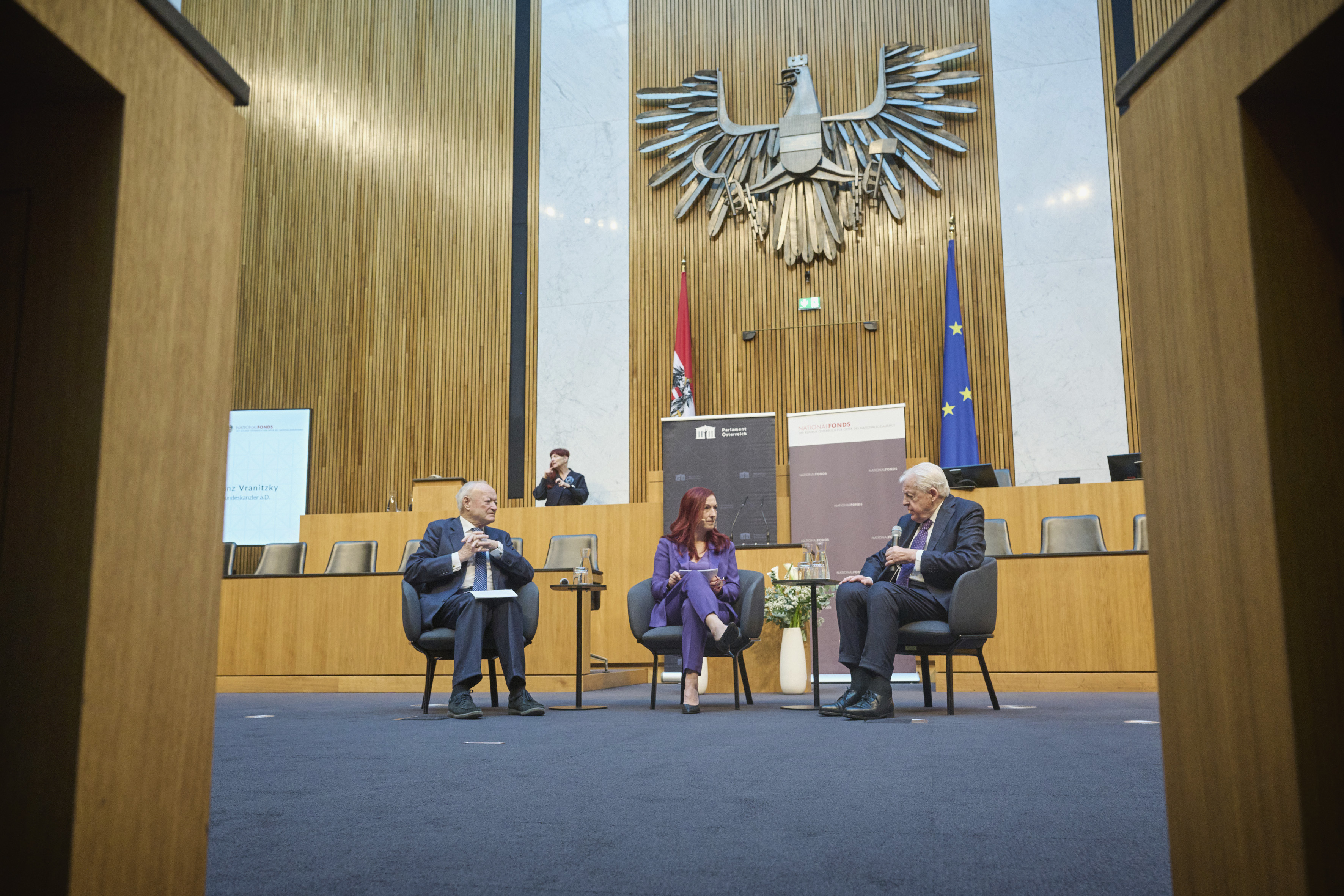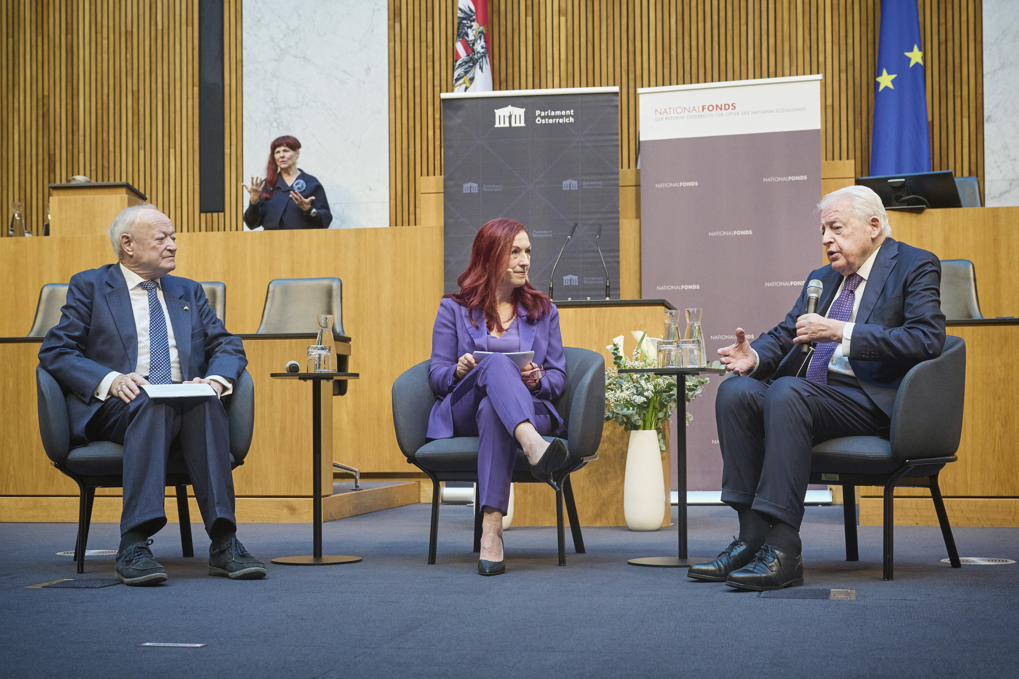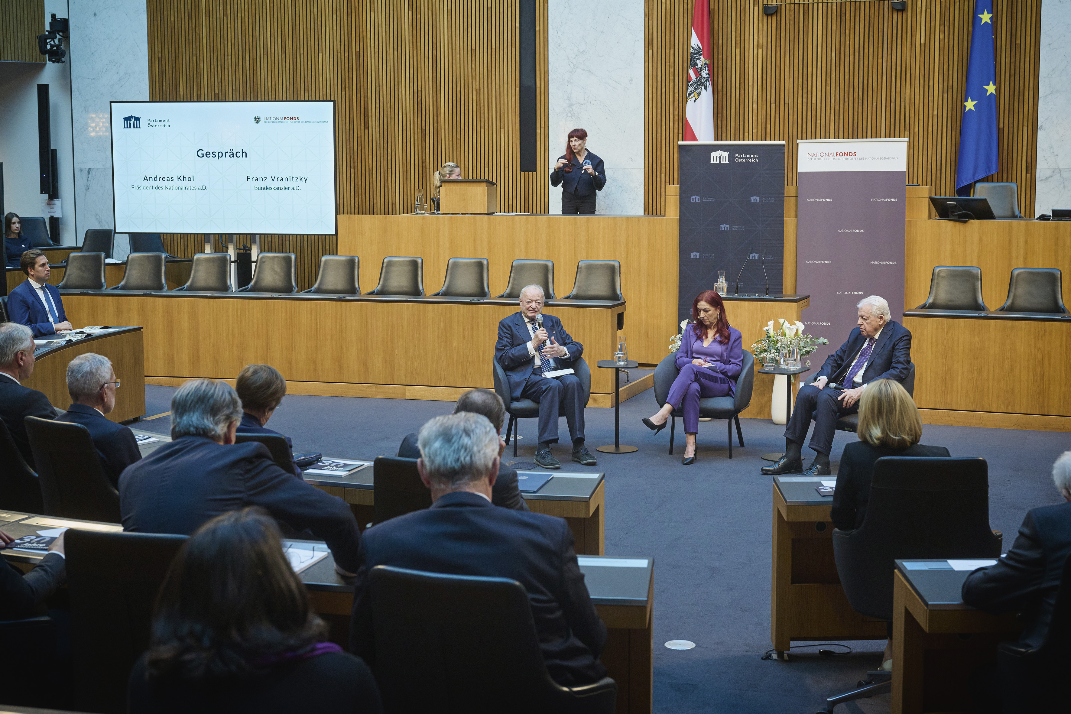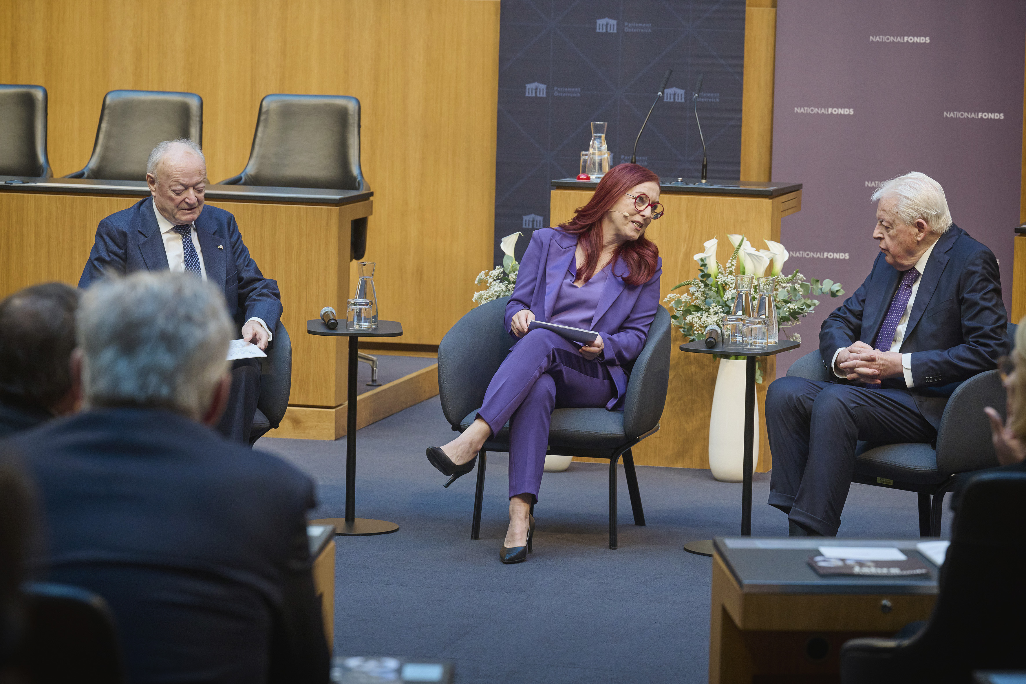In conversation. From left: Former President of the National Council Andreas Khol, Managing Director of the Austrian National Fund for Victims of National Socialism Hannah Lessing, former Federal Chancellor Franz Vranitzky. View towards the event participants.