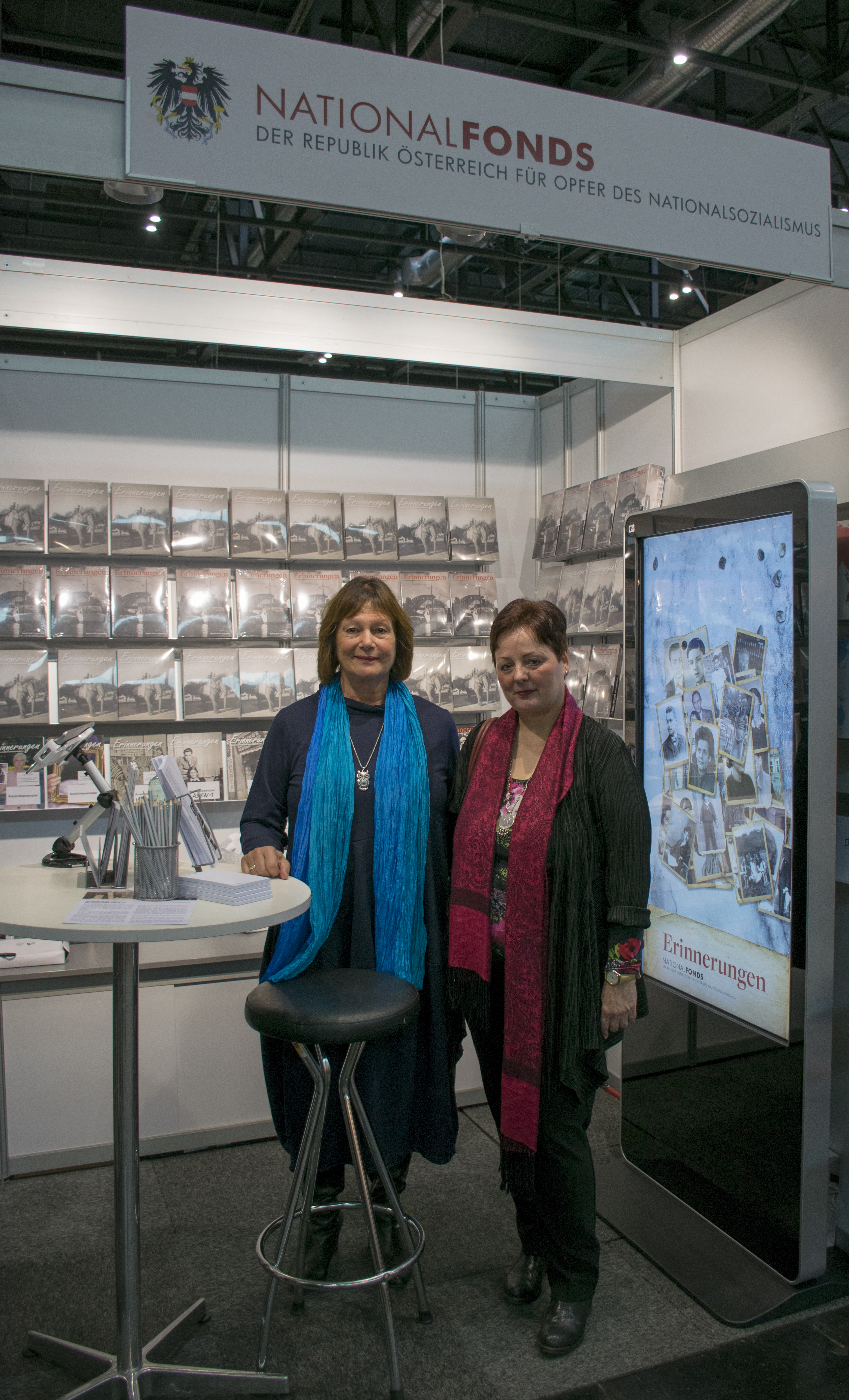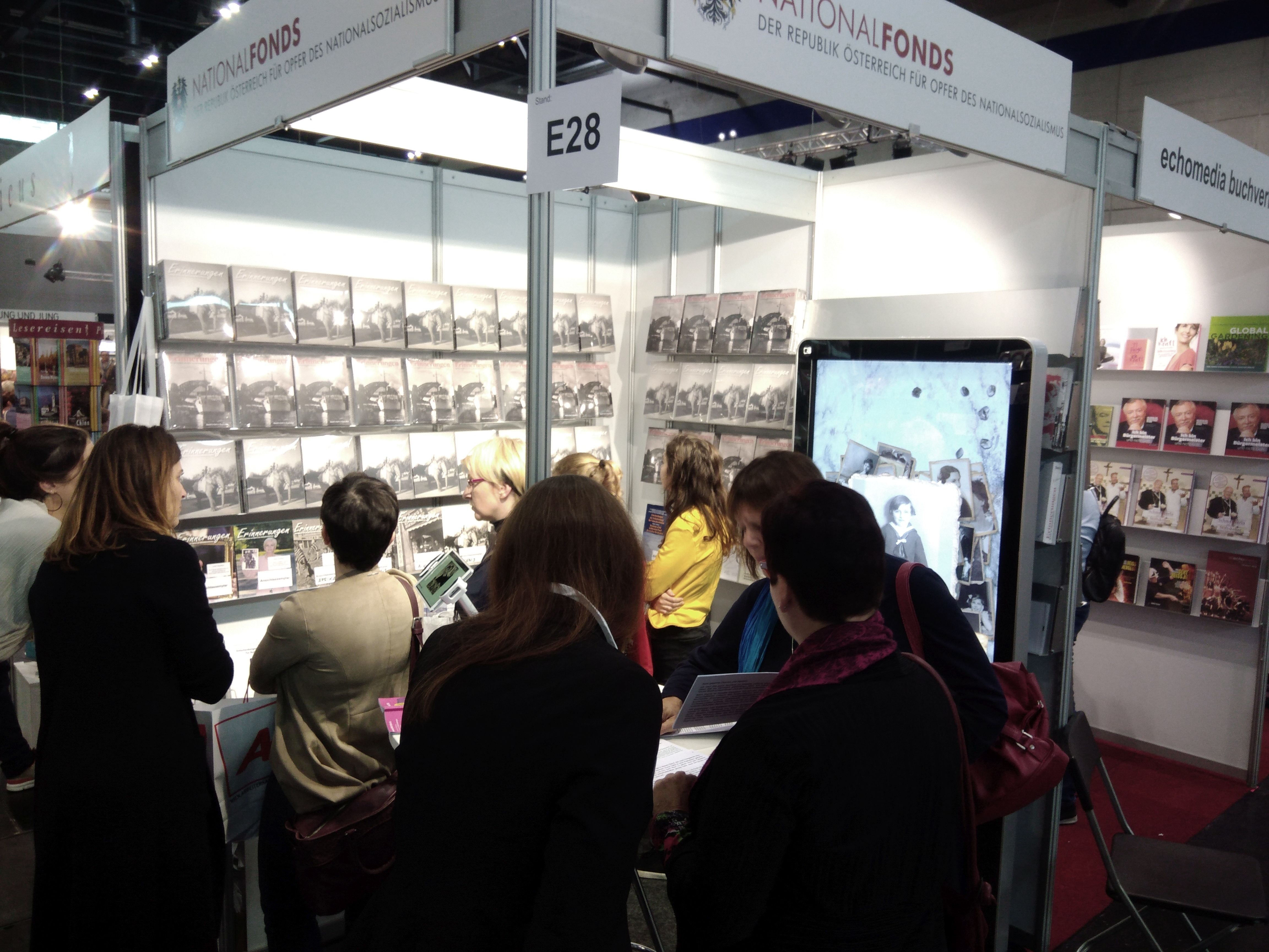 Ein besonderer Blickfang war ein großer Touchscreen, der dem Nationalfonds von der Firma ThisPlay zur Verfügung gestellt wurde. Auf einem großen Display konnte man die Fotos von Personen und Familien sowie deren kurze Biografien abrufen. Darüber hinaus gab es die Möglichkeit, der Opfer des Nationalsozialismus auf dem Touchscreen interaktiv zu gedenken: Die BesucherInnen der Messe konnten – analog zum jüdischen Brauch, einen kleinen Stein auf ein Grab zu legen, um dadurch die Verpflichtung auszudrücken, Verstorbene nicht zu vergessen – einen digitalen Stein auf dem Display hinterlassen.